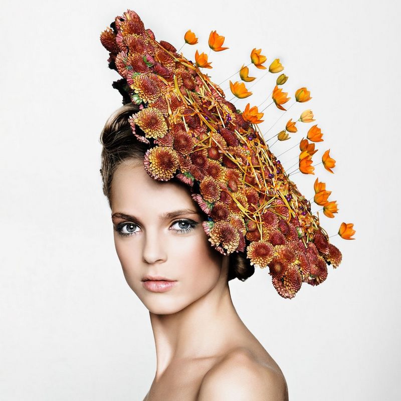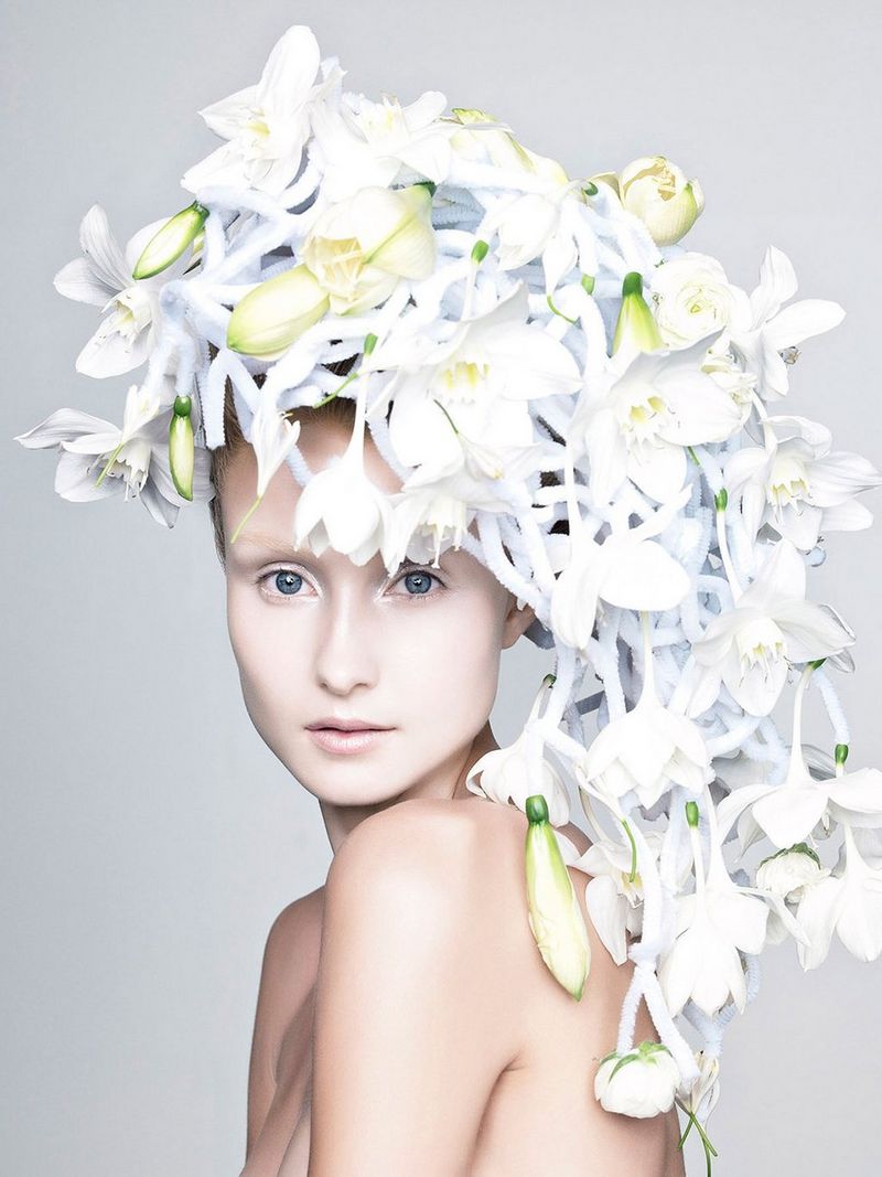 Inspired by nature, “Botanic Couture” is about using fanciful floral arrangements that take their inspiration from Haute Couture, a recurring theme in Stine Heilmann’s portraits.