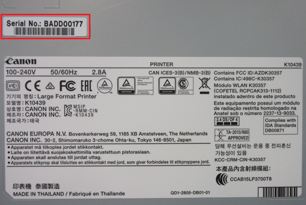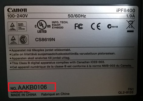 Serienumret på din imagePROGRAF iPF är en sekvens av 8 alfanumeriska tecken.