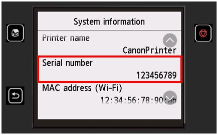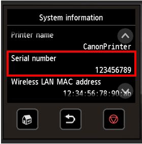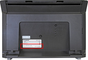 Placeringen av serienumret varierar mellan olika Canon-produkter. Serienumret är en kombination av siffror och/eller bokstäver, utan mellanslag eller specialtecken. Ignorera alla siffror och bokstäver som visas inom parentes.