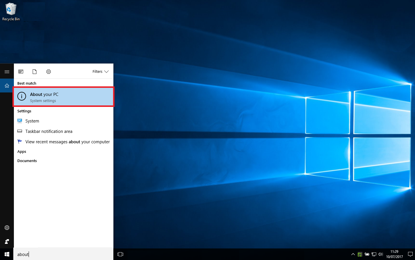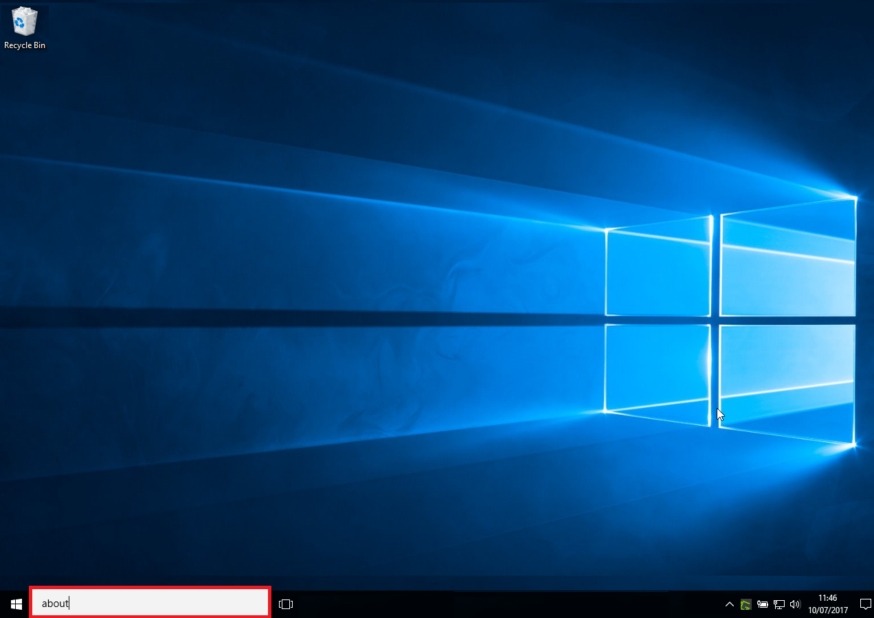 1. I sökrutan i Windows 10 skriver du in [Om].