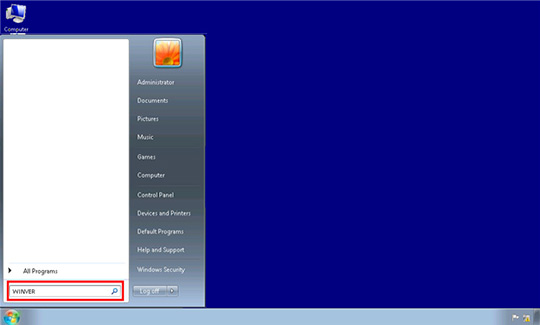 2. När menyn visas klickar du i det tomma sökfältet (markerat i rött) och skriver ordet WINVER, och trycker sedan på tangenten [enter/return].