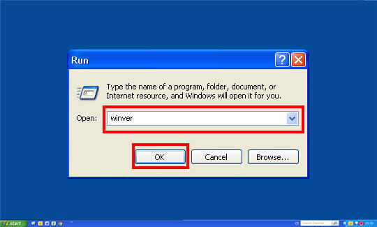 3. När rutan ”Run” visas skriver du ordet WINVER i den tomma, vita rutan (markerat i rött). Klicka sedan på [OK]-knappen (markerad i rött).
