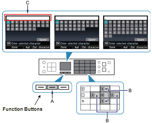 a. När ett tangentbord på skärmen visas (ovan) trycker du på funktionsknappen i mitten (A) och växlar till ett tangentbord som stöder de tecken du vill använda.