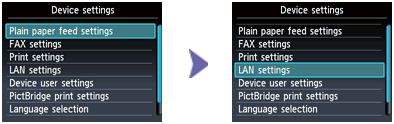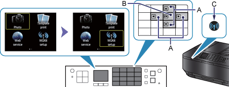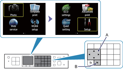 ] (A) för att gå till ikonen [Wireless LAN Setup] eller [WLAN Setup] och tryck på knappen [OK] (B).