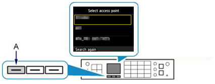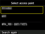 Om du är osäker på vilket namnet på det trådlösa nätverket är, kan det finnas på en tryckt etikett på åtkomstpunkten eller så kan du kontrollera nätverket som datorn är ansluten till. Om du inte ser nätverket i listan trycker du på vänster funktionsknapp (A) [Search again].