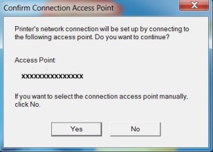 2. När skrivaren har identifierats visas följande skärm. Namnet på åtkomstpunkten som datorn är ansluten till visas (där "xxxxxxxxxxxxx" visas). Om det här är det trådlösa nätverk som du vill att skrivaren ska ansluta till klickar du på [Ja].