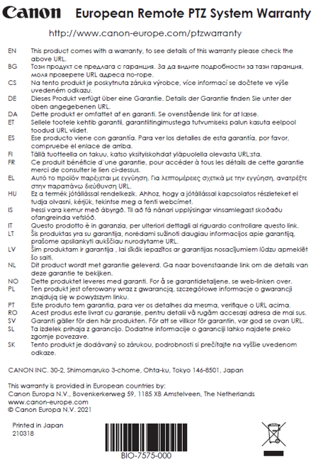 Canon PTZ-fjärrkameror eller -styrenheter avsedda för försäljning och som köps inom Europeiska ekonomiska samarbetsområdet (”EES” – dvs. EU, Island, Liechtenstein, Norge) samt Schweiz och Storbritannien (”territoriet”), omfattas av Canons europeiska garanti för fjärrstyrda PTZ-system. Canon garanterar att åtgärda eventuella fel utan kostnad (regler och villkor tillämpas – se nedan) om den nya PTZ-fjärrkameran eller -styrenheten visar sig vara defekt inom garantiperioden.