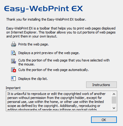 Easy-WebPrint EX är ett tilläggsprogram till Windows Internet Explorer som enkelt låter dig välja delar av en webbsida och "klippa ihop" dem till ett enda dokument att skriva ut. Det innefattar en förhandsgranskningsfunktion, en klippfunktion och en layoutredigeringsfunktion.